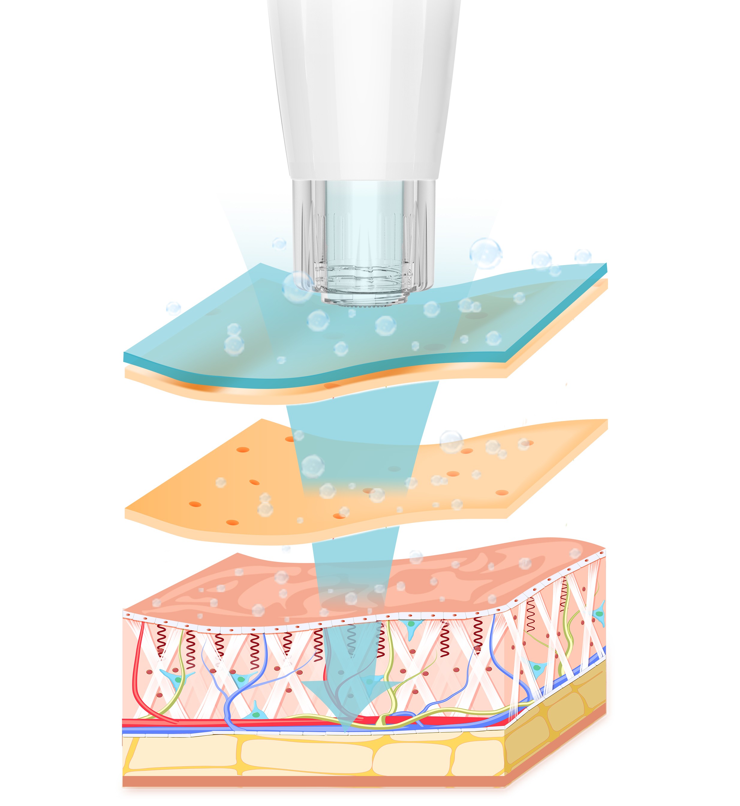 As the microneedling tip moves up and down, micro-channels are created and filled in the same pass, combining needling and infusion into one motion.