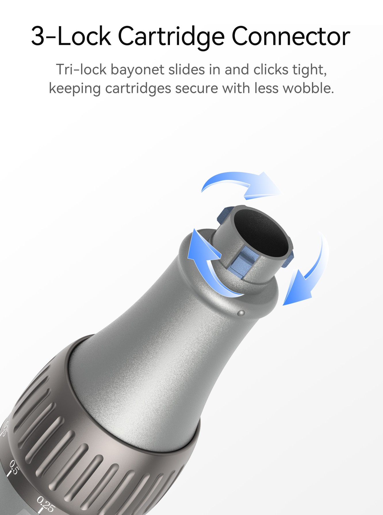 Twist on a sterile single-use cartridge until it locks in place and the tip is seated securely for a smooth, controlled flow.
